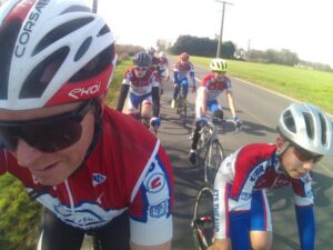 Beaucoup de précipitations ce samedi matin avec annulation de la séance « école de cyclisme » mais on se pose la question pour l’après-midi. Le départ est décalé à 14h30 avec réussite puisque la pluie a cessé vers 13h00 et les routes sont presque sèches avec le vent de Sud-Ouest. Départ par Saint Onen puis Gaël lieu …