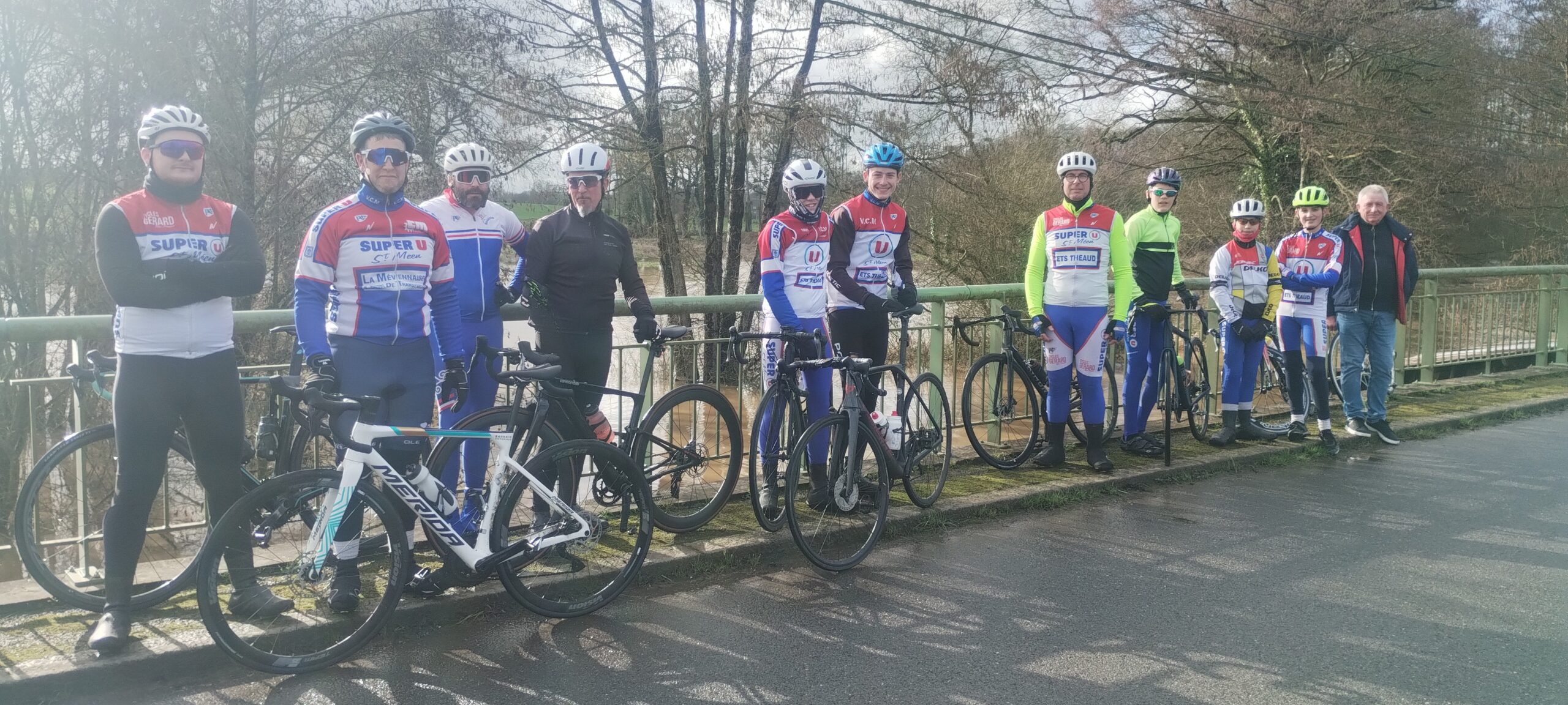Beaucoup de précipitations ce samedi matin avec annulation de la séance « école de cyclisme » mais on se pose la question pour l’après-midi. Le départ est décalé à 14h30 avec réussite puisque la pluie a cessé vers 13h00 et les routes sont presque sèches avec le vent de Sud-Ouest. Départ par Saint Onen puis Gaël lieu du premier incident avec une crevaison roue arrière dans Gaël. On repart puis arrêt sur le pont du Meu pour la photo de groupe: il y a de l’eau partout! Reprise en direction de Paimpont vent de face puis les minimes font demi-tour tandis que les plus grands se dirigent vers Les Forges. Les routes sont trempées en forêt : il faut faire attention mais malgré cela il y a une chute avec casse de vélo. Après avoir réglé le problème, le groupe repart vers Le Pont du Secret et Plélan sur une route qui dégouline du fait d’une nouvelle averse. Retour à Paimpont puis descente des Forges avec prudence pour une série de 30-30 menée par Francis au klaxon. Paimpont est de nouveau en vue mais il est déjà tard et nous décidons de rentrer en relais classique jusque Gaël avant de rejoindre le club. Personne ne traîne car il fait de plus en sombre et les corps sont tout de même bien humide.