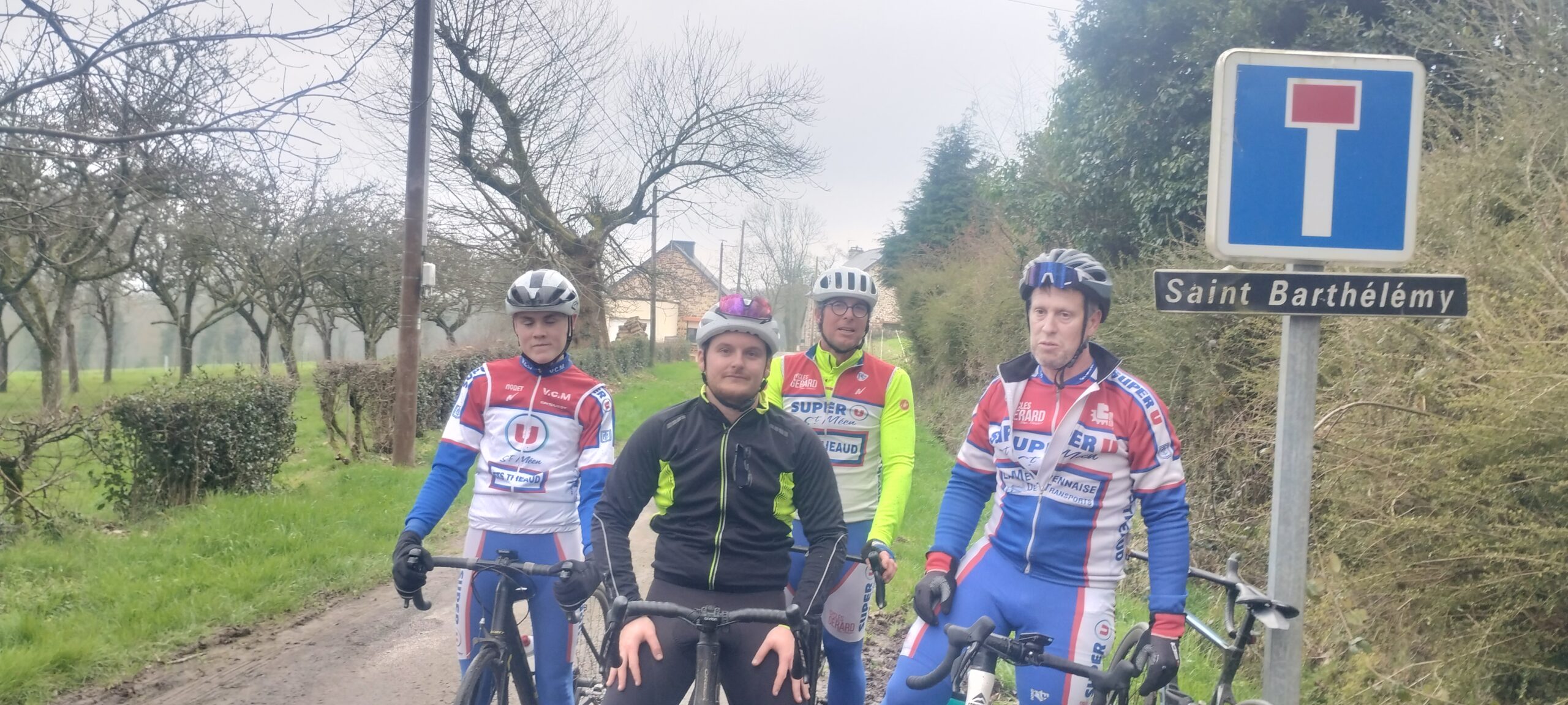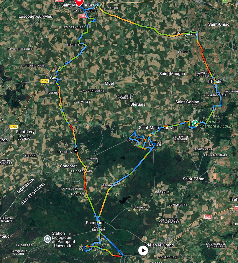 Dernière sortie groupée du samedi après-midi avec un petit effectif puisque les courses sont de retour. Le temps est moyen au départ avec quelques gouttes mais l’après midi va bien se passer sans une goutte sous un ciel gris brumeux et un vent très faible orienté au Nord. Départ vers Boisgervilly, Iffendic avant de grimper en parallèle du Tertron (côte de la Roche de Grette) puis direction La Chambre au Loup avant de rejoindre St Malon et La Marette puis de retourner vers La Ville Eon: sympa la petite côte! Retour à Merlin puis la longue ligne de Trompe Souris et Telhouët. A Paimpont, direction Saint Barthelémy: la plus difficile selon les principaux intéressés! Petit arrêt bienvenu pour la photo souvenir puis direction Le bas des Forges avant la remontée vers Paimpont. On finit avec un relais classique (en ligne) de Paimpont à Gaël vent léger de face. Une belle petite sortie de 80 bornes et près de 800m de dénivelé positif.