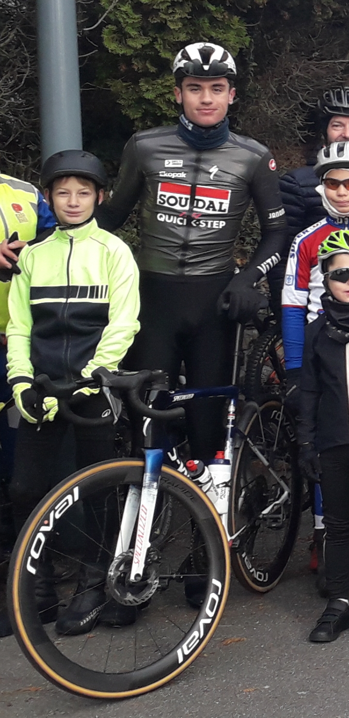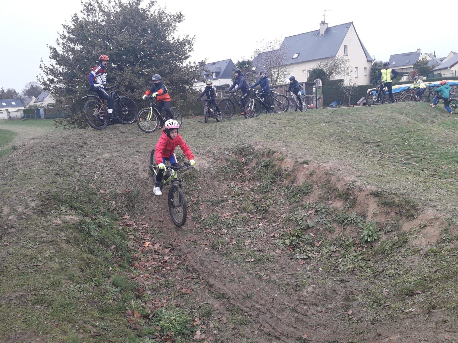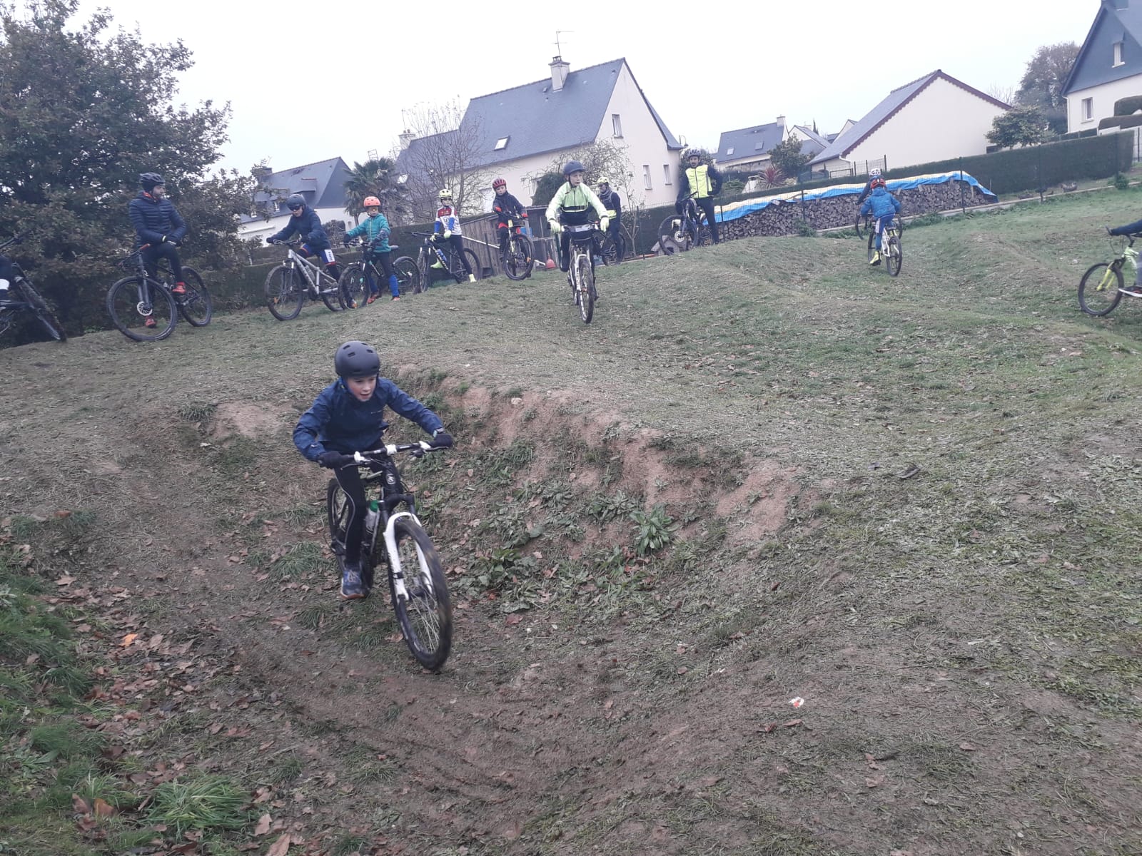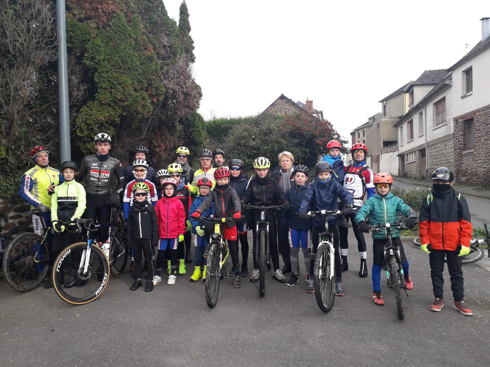 Il fait frais (3°) et humide ce samedi matin pour le rendez-vous hebdomadaire des jeunes de l’école de cyclisme mais l’atmosphère se réchauffe à l’arrivée de Luc Royer (licencié au club de benjamin à junior1ère année) qui s’arrête quelques minutes. Un petit bonjour à tout le monde (avec photo) et il est déjà reparti pour une sortie de 3 heures. Pour les jeunes, il faut rouler pour se réchauffer d’où la direction des bosses de l’étang (vidéo) qu’ils passeront de nombreuses fois et comme cela va bien, direction le terrain de bosses de Saint Onen qui devient vite gras. Retour par Les Tertres et La Durantais juste avant l’arrivée de la pluie qui va tomber tout l’après-midi…