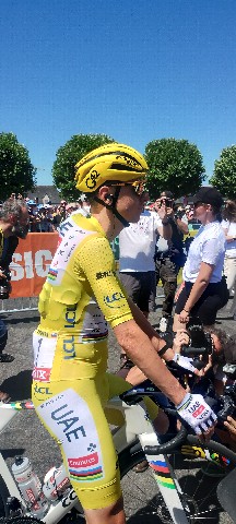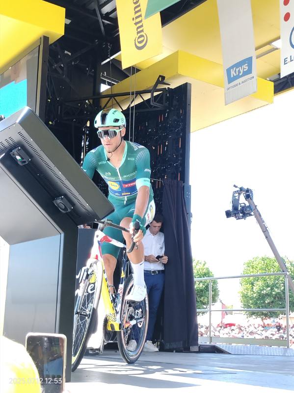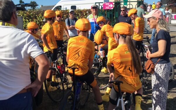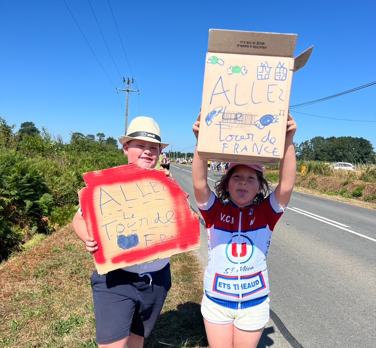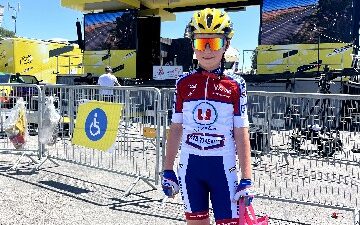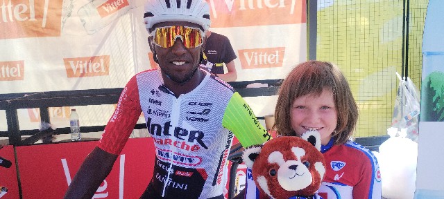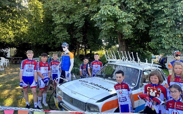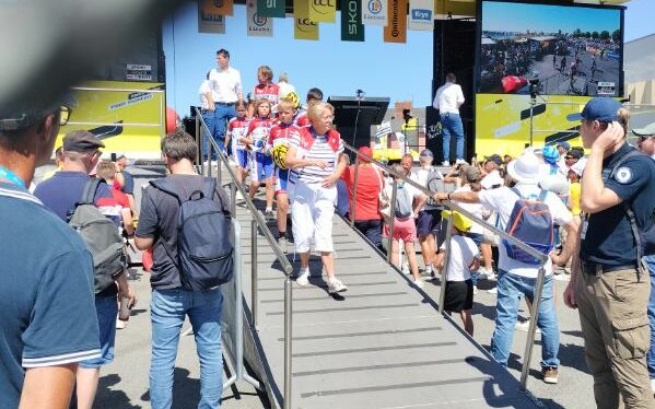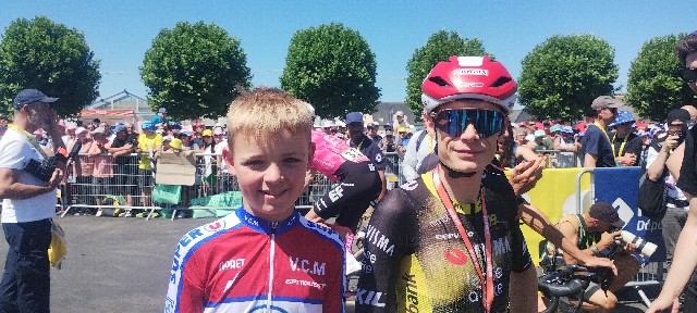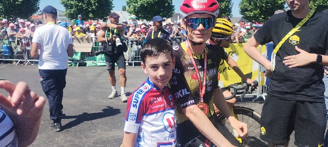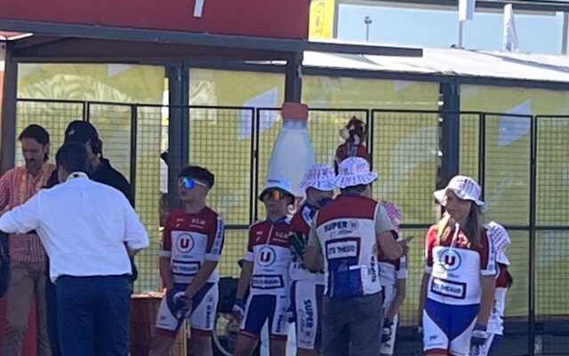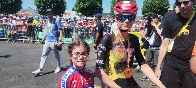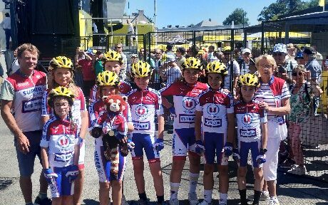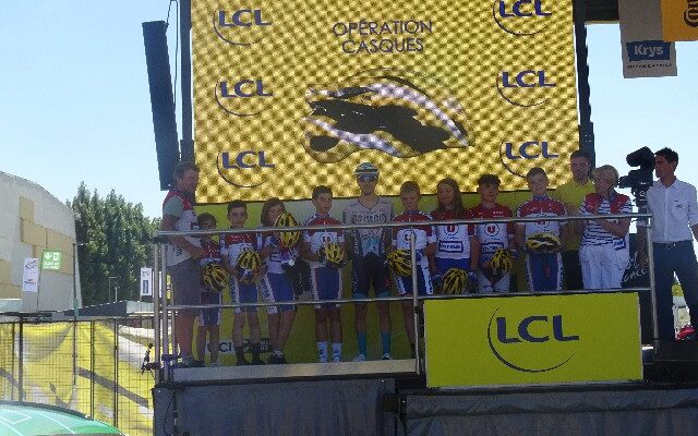 Deuxième opération, celle concernant les casques jaunes destinée à 8 jeunes des catégories U13 et U11. Rassemblement au local du club pour 10h00 puis direction le stade avec passage devant les véhicules de la caravane publicitaire. Au milieu de la rue du Stade, les responsables LCL nous prennent en charge direction le podium protocolaire. Les 8 jeunes (Jordan, Louka, Célestin,Théo, Louane, Brewen, Ennaëlle et Yann) sont accompagnés par Pascal et Annick. Emplacement idéal pour voir la caravane publicitaire (et récupérer des lots!) puis vers 11h15, au début de la signature des coureurs sur le podium, montée sur le podium. Lenny Martinez remettra les 8 casques jaunes aux enfants (vidéo). Descente du podium puis retour dans l’espace réservé: tous les coureurs passent devant nous. Quelques uns se prêteront à la photo. Un grand moment puisqu’il est exceptionnel de voir tous ces champions d’aussi près. Puis les coureurs se rassembleront pour le grand départ. Fin de la matinée vers 13h30 avec d’énormes souvenirs dans les têtes!