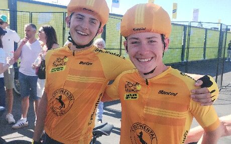 Tout d’abord « La Continentale » réservée aux cadets: 8 coureurs ont été sélectionnés (2 du VC Mévennais ( Louis et Simon), 2 de l’AS Romillé et 4 du VC Plélanais). Rendez-vous pour 9h30 sur le côté du terrain stabilisé (Près des véhicules de la caravane publicitaire) afin de recevoir l’équipement « Continental »: couvre-casque, maillot, cuissard et couvre-chaussures jaunes. Petit briefing puis départ devant la caravane publicitaire (vidéo rue Louison Bobet) pour 30 kilomètres à vélo sur la route du tour jusque Gévezé. Puis les vélos et les coureurs montent dans les voitures et sont redéposés sur la route 30 kms avant la ligne d’arrivée afin de faire la fin de l’étape avec un passage sous la flamme rouge et un sprint final remporté par Louis. Direction ensuite la tribune Henri Desgrange pour suivre l’arrivée à Laval.