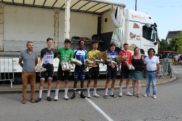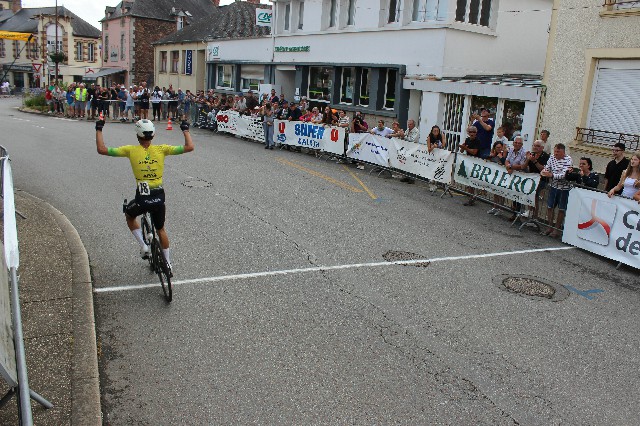 Une course pour les Open 1, 2 et 3 était aussi au programme pour ce 14 juillet à Mauron. Un peu plus de 40 coureurs sont sur la ligne de départ à 15 heures afin de parcourir les 50 tours de circuit. Le vent s’est un peu calmé suite à une bonne averse survenue en début d’après midi mais les routes sèchent rapidement. Départ rapide puis trois coureurs se détachent vers le dixième tour: Yafiet MULUGETA du Centre Mondial du Cyclisme qui a déjà terminé deuxième hier à La Prénessaye, Noah DELONGLEE d’Avranches et Quentin LESONGEUR du Team Pays de Briec. L’écart va vite monter à une trentaine de secondes. Divers groupes vont se former à l’arrière avec un peloton vigilant jusque mi-course puis 5 coureurs dont le champion de Bretagne Maxime RIO du Team Pays de Briec vont se retrouver dans un contre, contre qui va exploser à quelques tours de l’arrivée à la suite d’une prime sous l’impulsion de Nicolas DAVID du CC Ergué Gaberic. Seul le champion de Bretagne prendra sa roue. Ils reviendront à une vingtaine de secondes. A l’avant, on ne se pose pas de question, avec une entente parfaite jusqu’au sprint final lancé au cimetière par Quentin LESONGEUR qui sera remonté par ses deux camarades d’échappée. La victoire finale va revenir au normand DELONGLEE et ce sera donc de nouveau une seconde place pour le jeune coureur du Centre Mondial du Cyclisme. Les coureurs arrivent ensuite un par un jusque la neuvième position avec un sprint du peloton remporté par Mathieu LAURENT du Team Pays de Briec devant Lucas QUELLEUC, l’ancien mévennais, dorénavant licencié à L’AC Noyal Chatillon qui termine 1er U19. La place de premier Open 2 revenant à Ellie JEHANNIN PELLOIS (DC Quédillac) et celle de premier Open pour Aloïs LEBRETON de Malestroit.