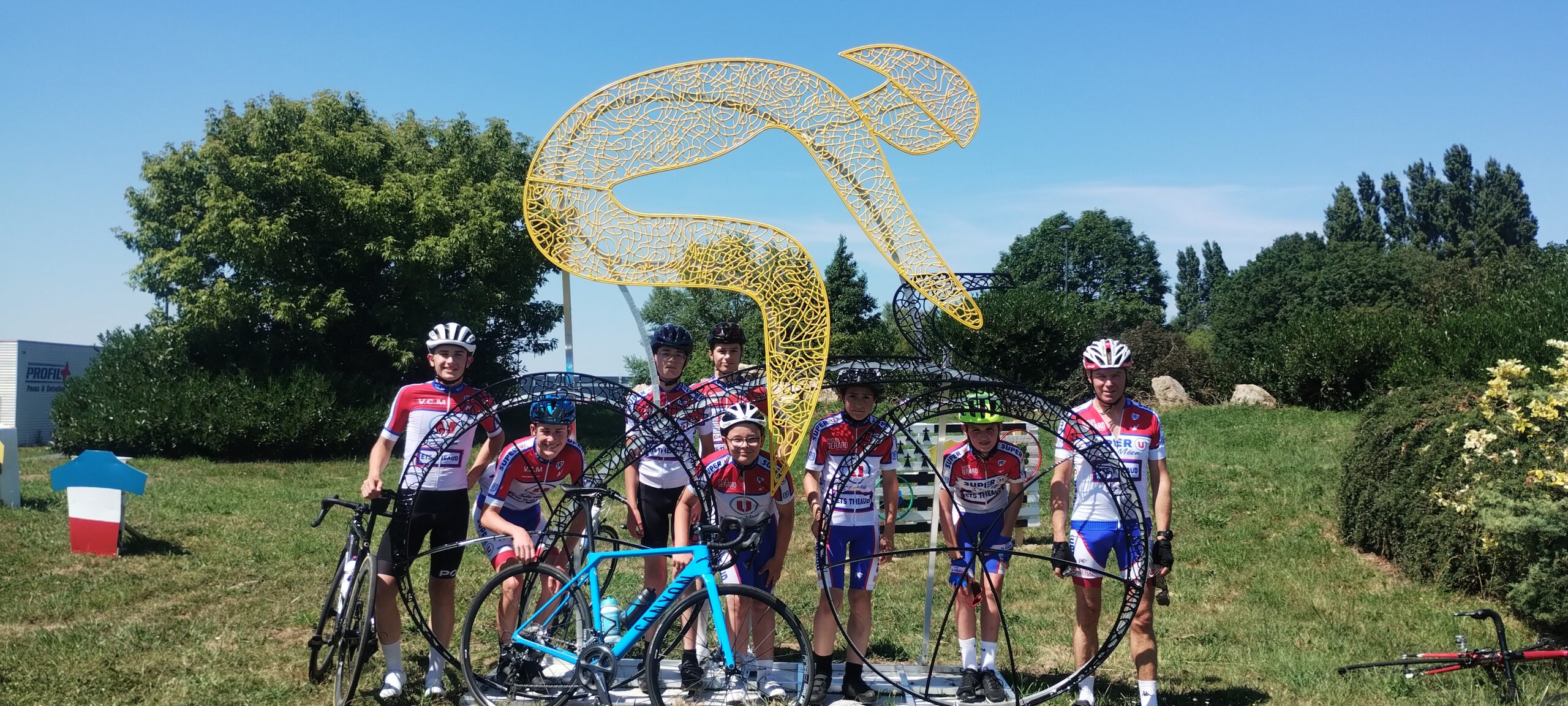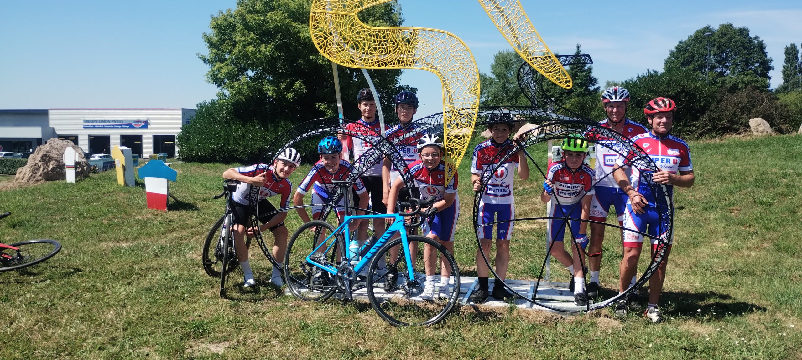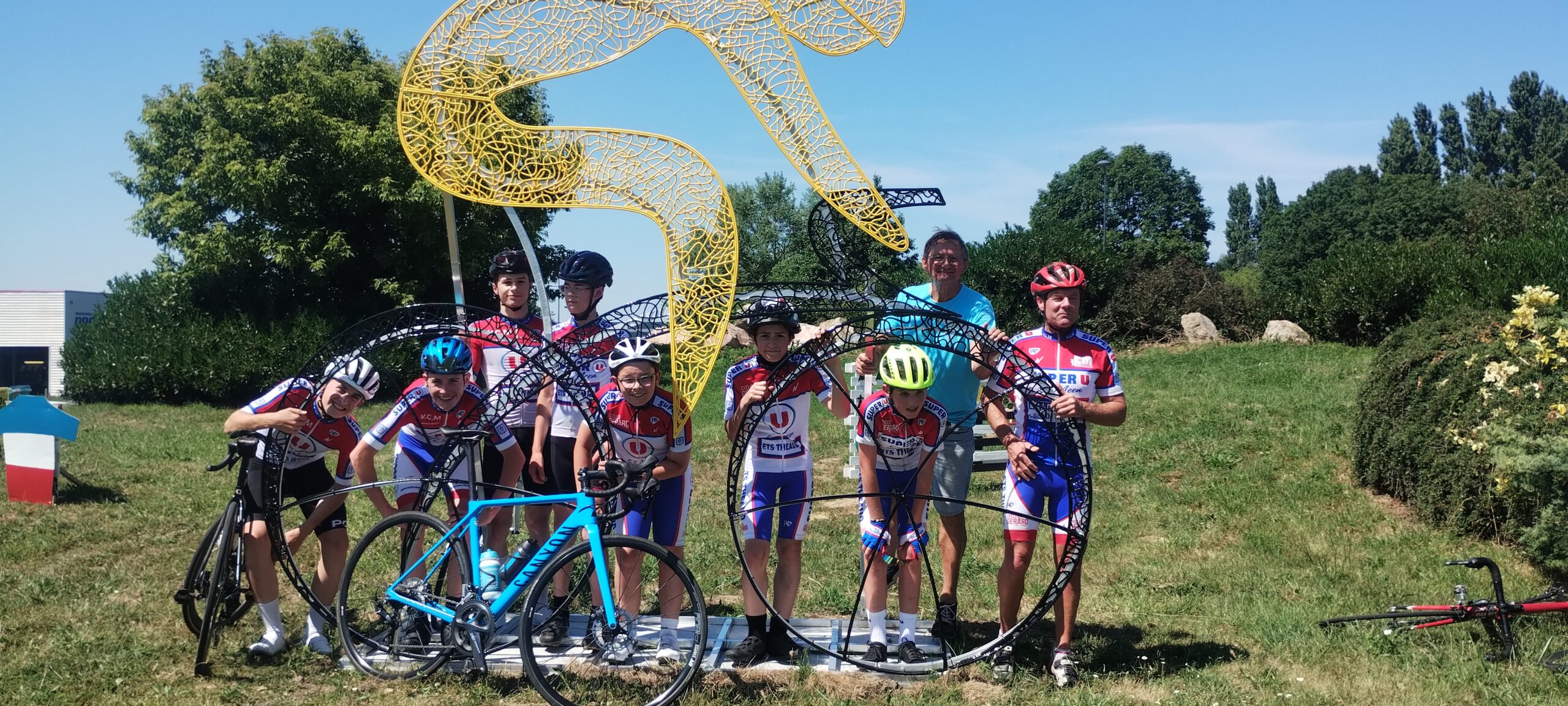 Deuxième mercredi sous un chaud soleil (environ 30°) pour les minimes et cadets du VCM. Direction de nouveau les bords la forêt de Brocéliande afin de profiter d’une certaine fraîcheur. Départ vers le Bois Basset puis la petite route (avec gravillons: c’est de saison!) vers Muel. On monte le long de la carrière à l’abri du soleil vers Comper puis de l’ombre jusque la Motte de L’ourme. Une petite côte (le haut Avril) puis descente sur Muel avant de rejoindre St Onen avec passage par Kermené direction le rond-point du Maupas pour une photo de groupe avec le vélo du Tour de France. La même photo que celle prise avec l’école de cyclisme mais pas au même endroit…